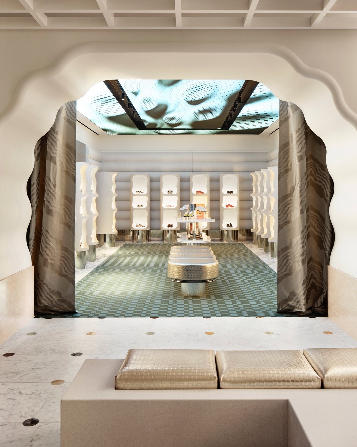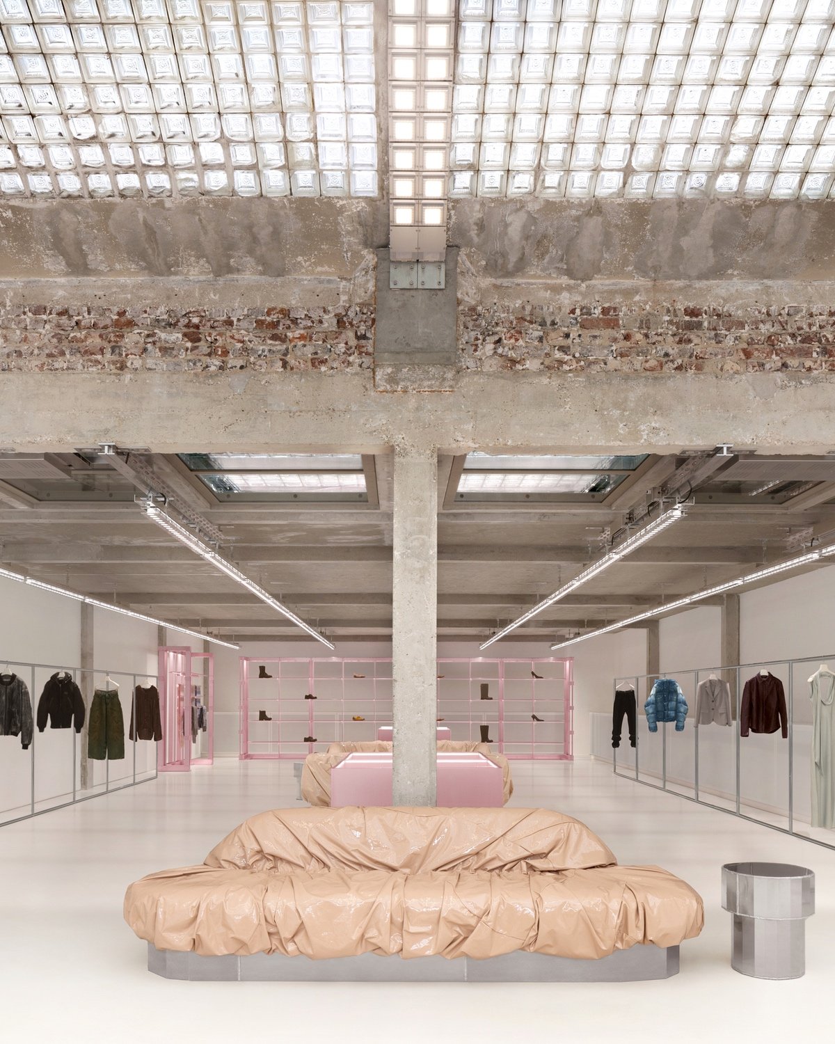 Milan showroom at Palazzo Molteni with white couch and coffee table, with black columns