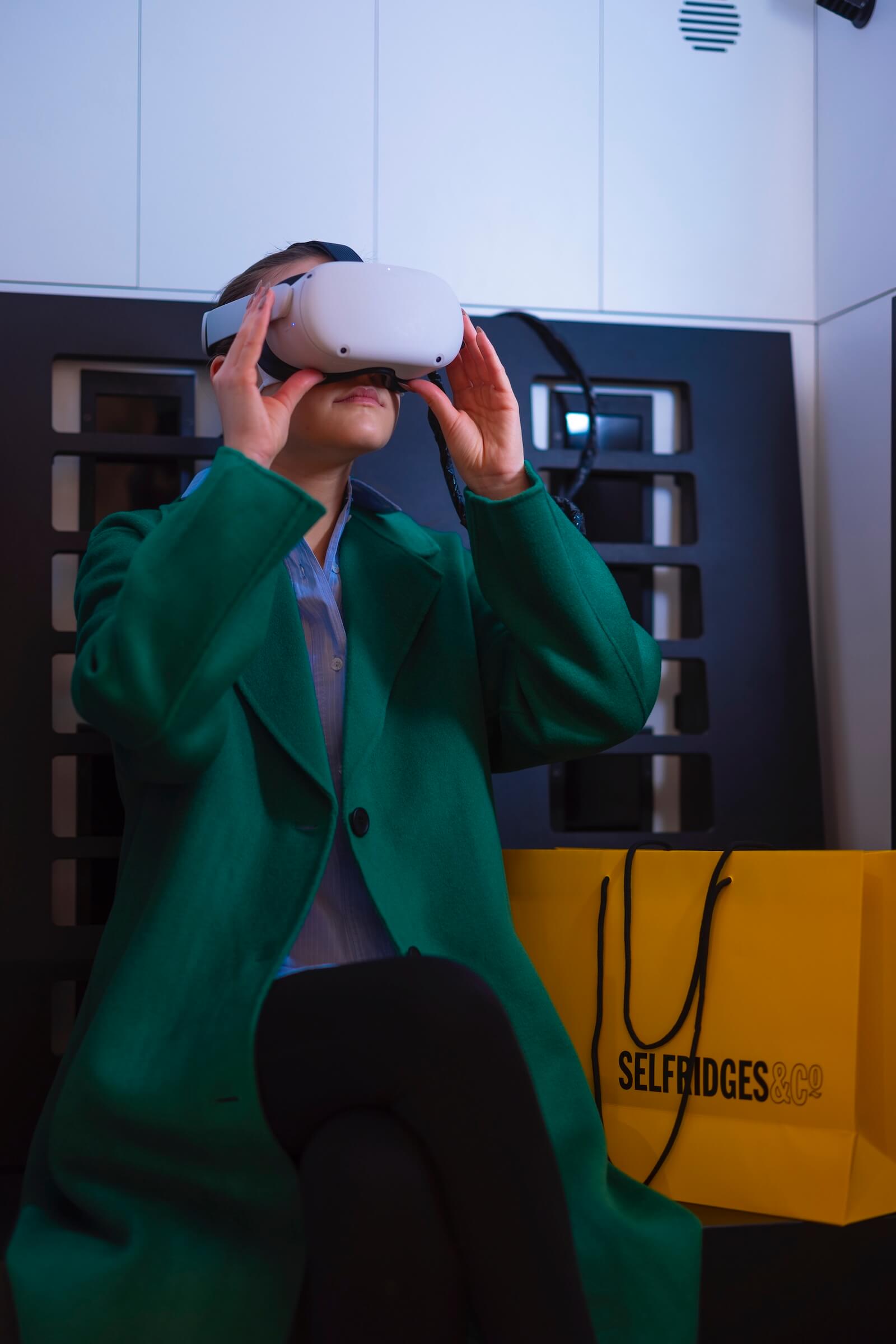 view of Shanghai store from low vantage point, showing the paving stone floor in context of display walls and outdoor courtyard greenery